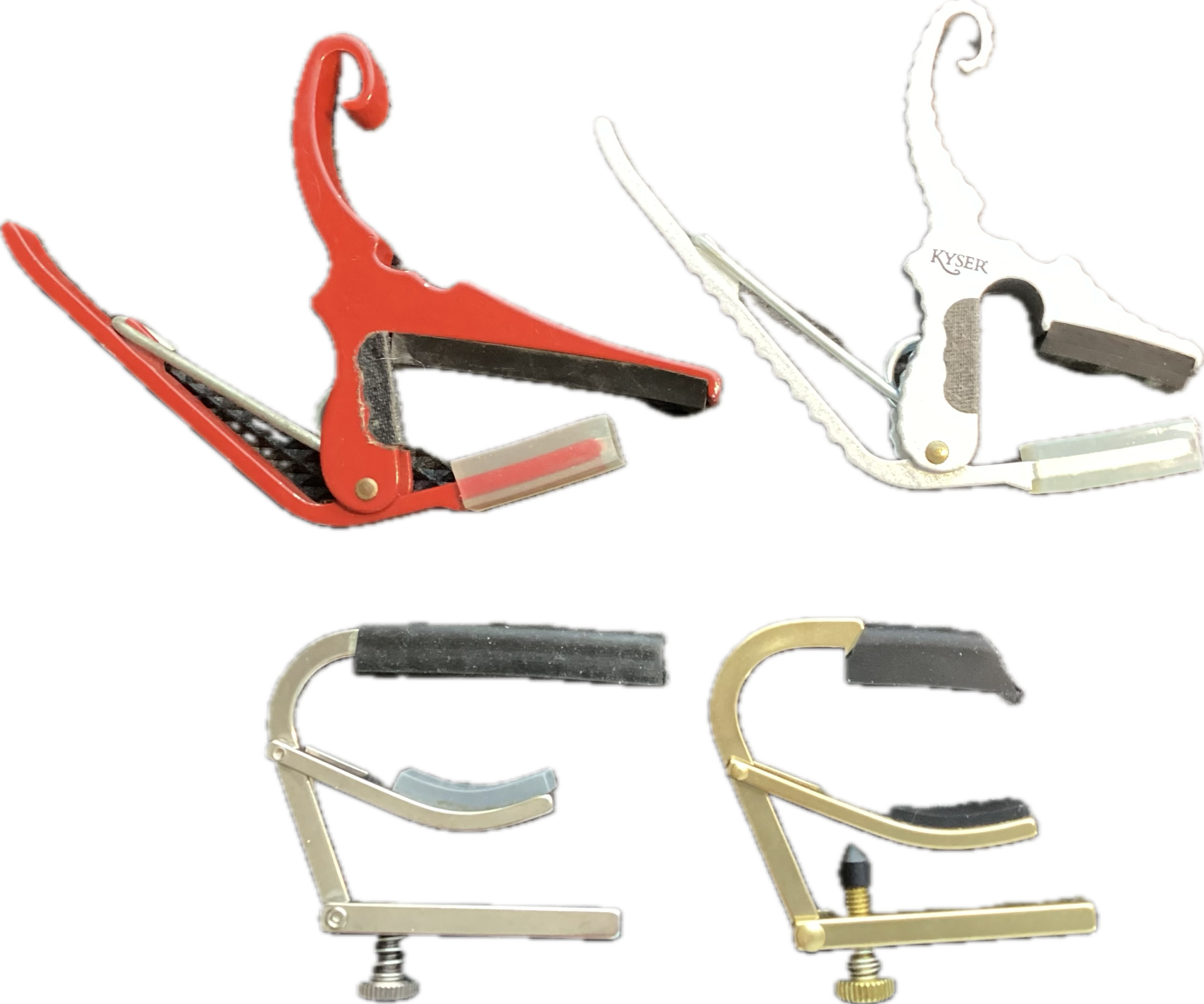 This is a GREAT question! If you look at the two capos below, you will see one is longer than the other. (Red & white capo.) The longer one is used by all guitarist to change keys of songs, making the songs easier to sing or play using preferred chords, and it covers all 6 strings. If you look at the two shorter capos (white & gold) you will notice that it is shorter and it will only cover 3 strings on the guitar. The short-cut/partial capo alters the tuning of the guitar without having to manually retune the guitar. By using the short-cut/partial capo this new tuning allows the student to play much easier chords using 1-2 fingers, and allows for quick success in playing guitar.